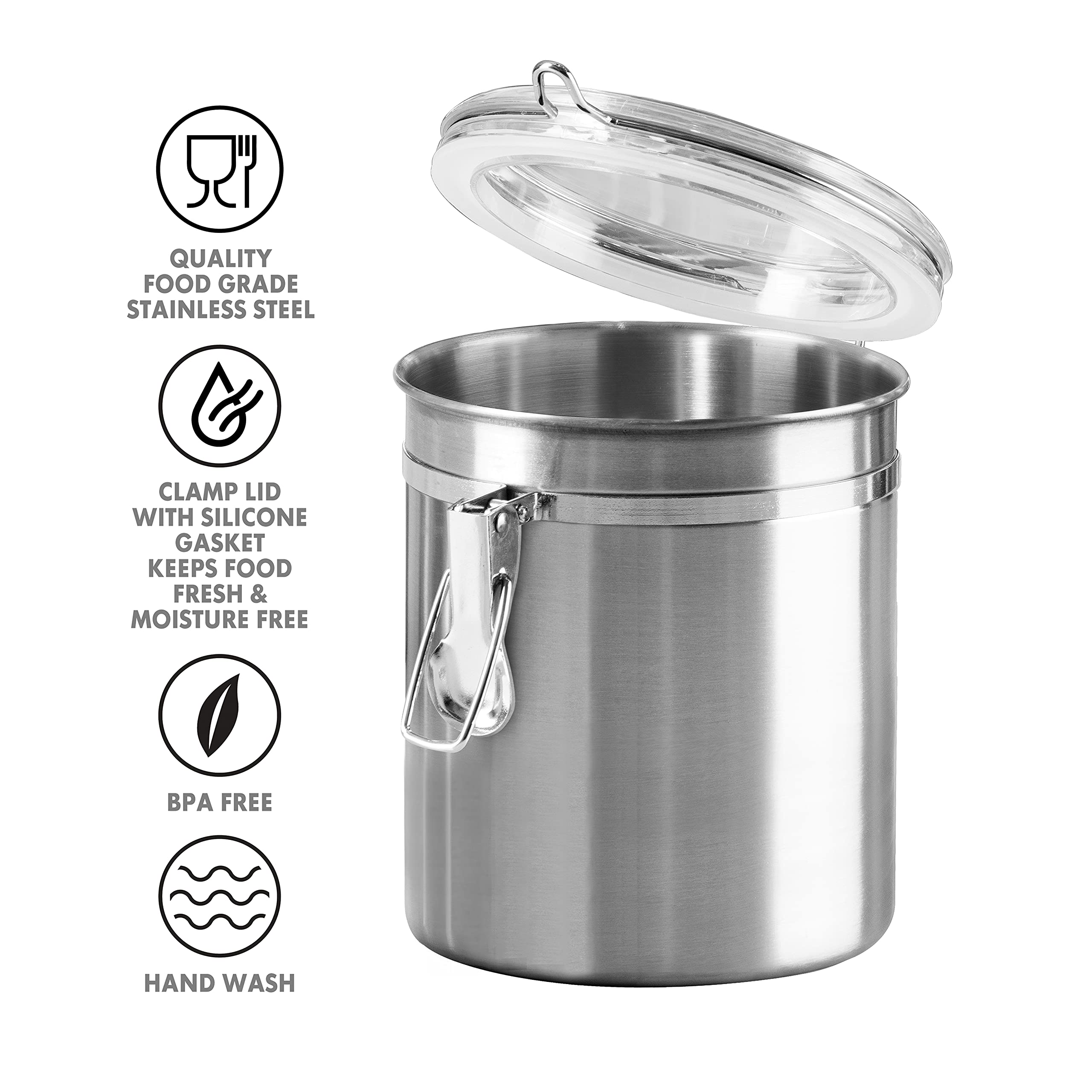Oggi Set of 4 Stainless Steel Kitchen Canisters - Airtight Clamp Lid, Clear See-Thru Top - Ideal for Kitchen Storage, Food Storage, Pantry Storage - Includes 1 each: 26oz, 36oz, 47oz, 62oz.