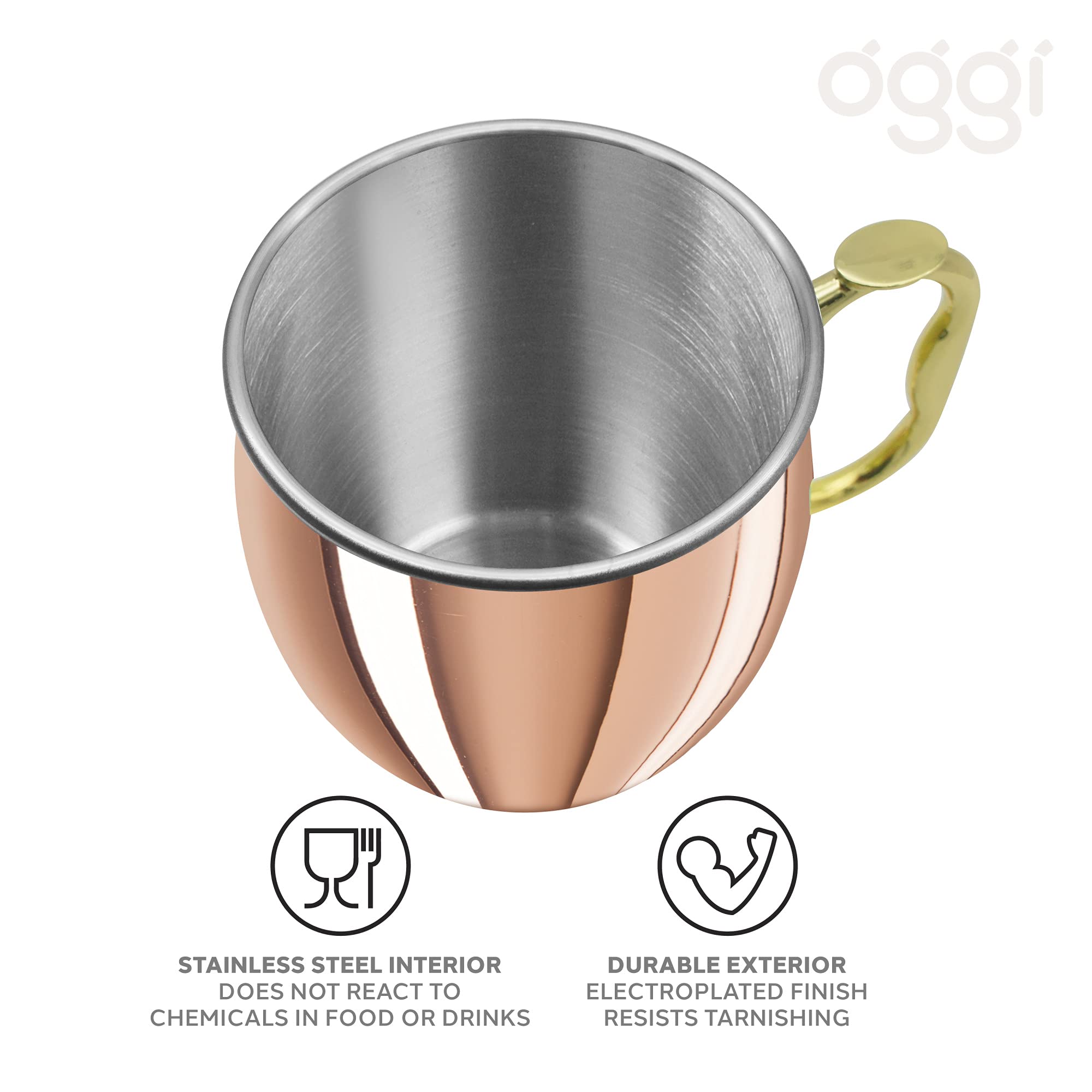 - STYLISH DESIGN & LARGE CAPACITY: Enjoy an icy-cold Mule the classic way in this OGGI Moscow Mule Mug. Its large capacity is perfect for adding extra garnish, ice or just simply not re-filling as often! Its solid easy grip handle ensures a steady hold as well as a comfortable thumb rest!