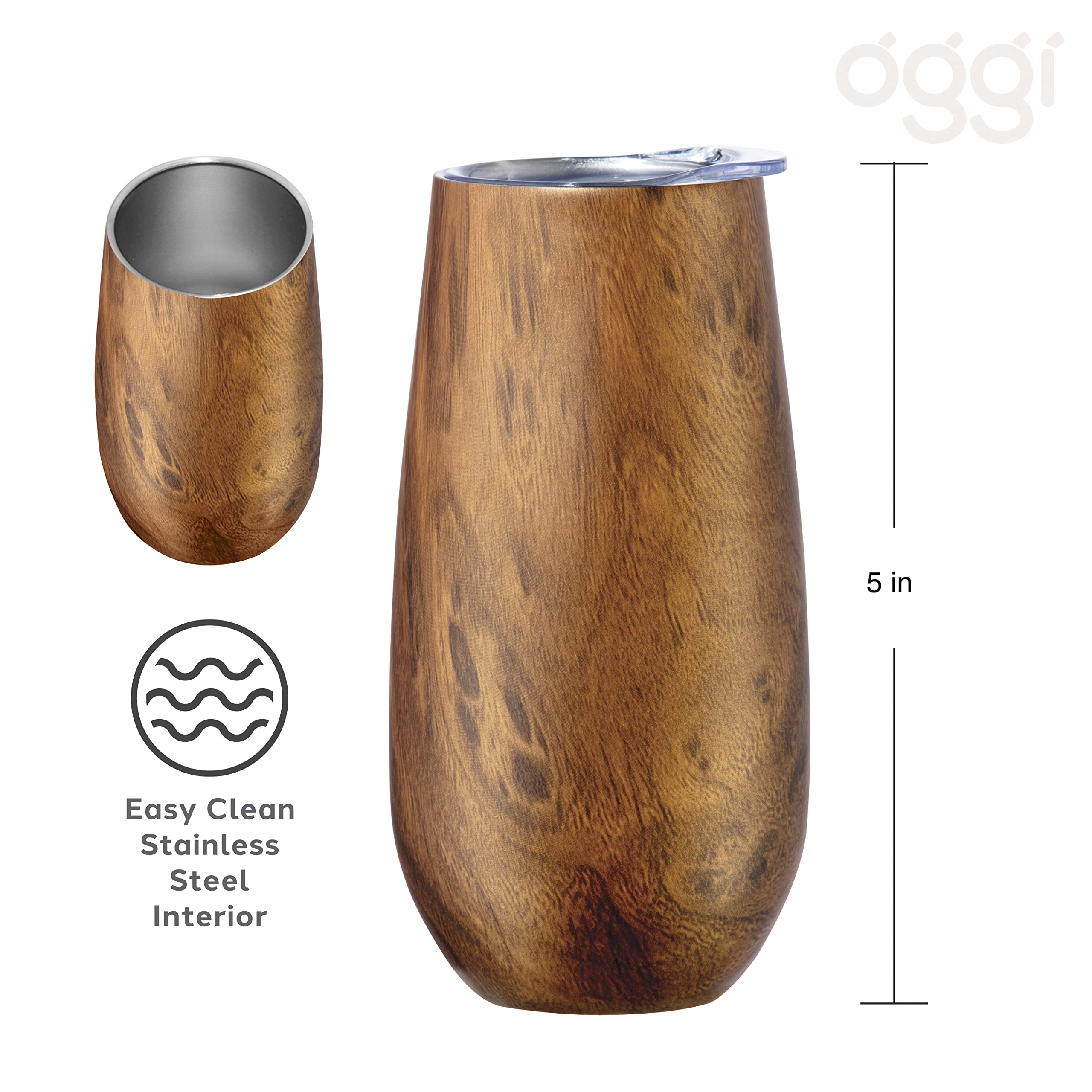 OGGI Thermo Flute 'Celebrate Collection' Stainless Steel Insulated Champagne Flute Tumbler - Wood Grain, 6oz, with clear sip lid.